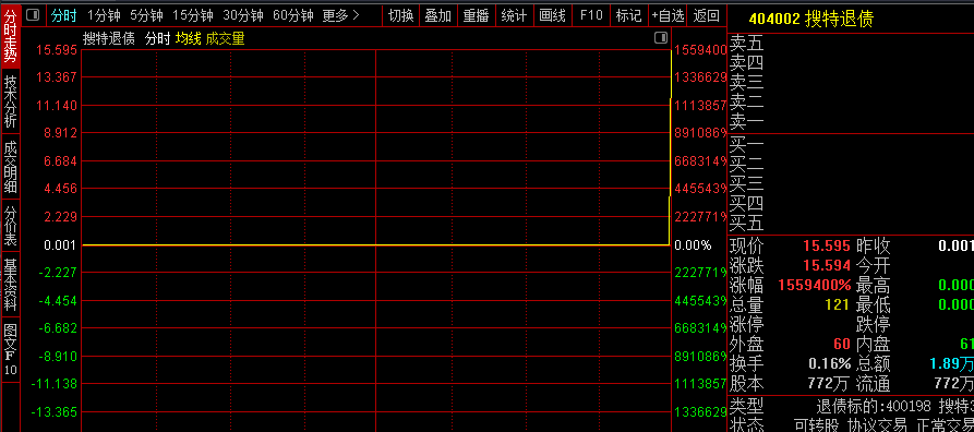 《每日经济新闻》记者注意到,15.595元/张的价格虽不是搜特退债历史最高价,但1.5万倍的单日涨幅,已经让不少投资者直呼“见证历史”“见证奇迹”。