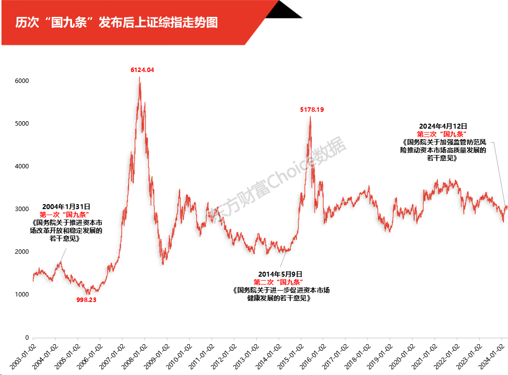 有资深资本市场人士指出,本次国九条背景和意义重大,历史来看,2004年、2014年以及今天十年一次国务院专门出台针对资本市场高质量发展的“国九条”,前两次之后出现2007年沪指6124点、2015年的5178点,相信本次真正的牛市亦在孕育之中。