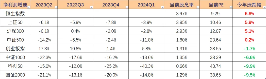 截至4月底,一年一度的年终财报季又结束了,A股所有公司都已经发布完了2023年年报和2024年一季报,和往年一样,小七第一时间从wind上整理了所有主流指数当下的业绩表现和估值水平,详见下图: