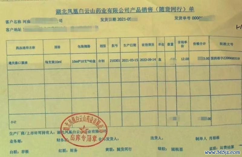 记者向华北地区一家医药公司了解购买通关藤口服液情况,对方出示的湖北凤凰白云山药业公司产品销售(随货同行)单显示购买了2021年3月15日生产的通关藤口服液,生产批号是210301。另外,还出示了与销售单上购买数量相同的发票。