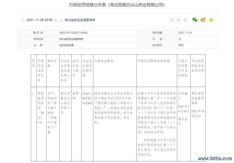 湖北省药品监督局官网消息显示,2021年3月15日凤凰白云山药业公司生产的通关藤口服液被认定劣药。湖北药监局官网截图